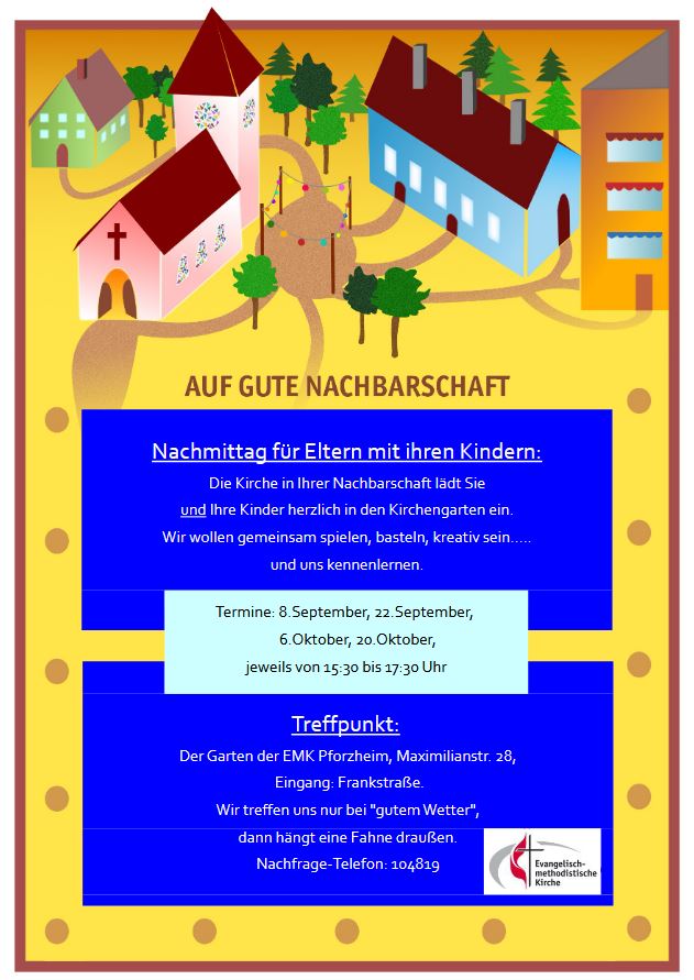 "Auf gute Nachbarschaft" lautet das Motto von vier Nachmittagen im September und Oktober 2022. Am 8. und 22. September und 6. und 20 Oktober laden wir jeweils von 15.30 bis 17.30 Uhr Eltern mit Kindern von 5 bis 10 Jahren in unseren Kirchengarten ein zum Spielen, Basteln, Kreativ sein, einander Kennenlernen.